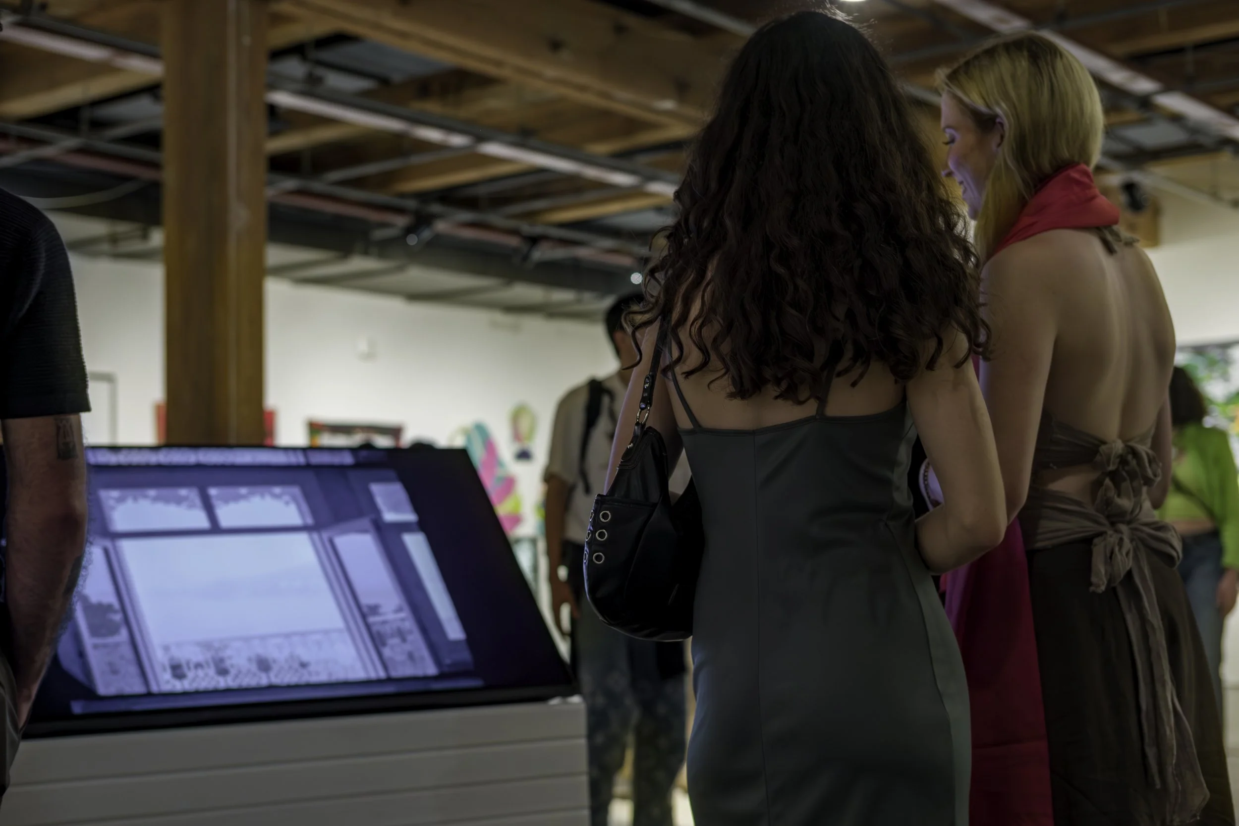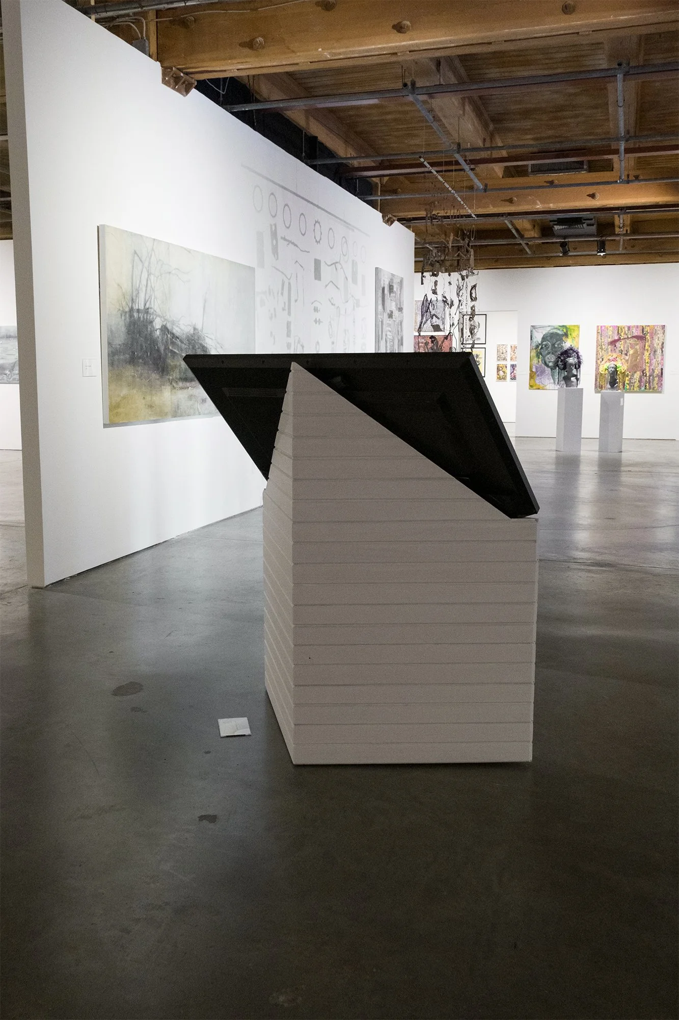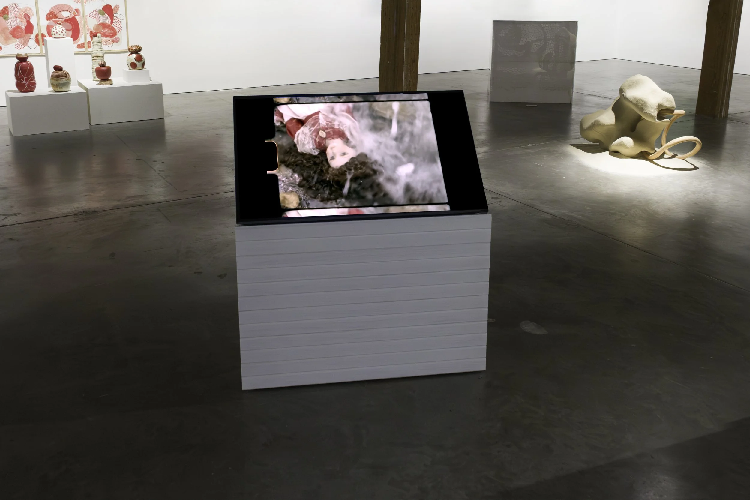 For this exhibition, the video was displayed on a LCD screen mounted on a triangular stand built by me. The screen balanced on the top of the structure leaning at the viewing angle I determined for viewers to engage with the screen from the front and its structure as they navigated around it. I finished the stand with wood house siding to in reference of the old Istanbul architecture present in the video as well as the the city of New Orleans that now hosted the piece.